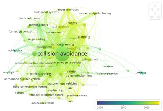 The development status of USV route planning is considered an active research area and continues to evolve. Route planning addresses three primary challenges: firstly, accomplishing the task of moving from the initial point to the final destination; secondly, avoiding obstructions along the way; and lastly, selecting the ideal course, which can prioritize minimizing time or conserving control effort []. Intelligent ships often follow fixed routes for definite transportation tasks. Global offline route planning is employed in such cases and utilizes different algorithms, for example, A* and visibility graph to find paths grounded on a stationary or well known environment model. However, changes in the environment, such as the movement of other ships, fluctuating depth of the water, or altering scheduling responsibilities, present challenges for intelligent vessel routing. Figure 1 shows a comprehensive scientometric analysis that was conducted using VOS viewer and that focuses on the co-occurrence of keywords among authors within the academic literature spanning from the year 2000 to 2023, utilizing data extracted from the Web of Science database. The keywords used to get the data are ‘USV route planning’, ‘USV collision avoidance’, and ‘USV path planning’, from which relevant information was extracted to conduct the scientometric analysis.