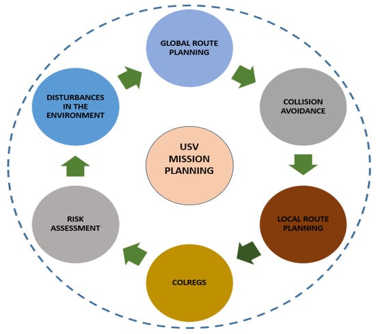 One popular approach is to use AI algorithms and machine learning to create optimal routes for USVs. Researchers have used techniques such as reinforcement learning, genetic algorithms, and neural networks to develop intelligent route planning algorithms for USVs. In the literature [], researchers have developed a revolutionary method to enable autonomous collision avoidance. Deep reinforcement learning (DRL) is a component of the distributed multi-USV navigation technology they have devised. This approach addresses the issue of collision prevention route planning even in the presence of limited information by combining the idea of reciprocal velocity obstacles (RVOs) with the DRL scheme. In general, the problem of route planning or mission planning involves creating viable paths or trajectories for a vessel to follow. The mission can be predetermined by a human operator or adjusted during the voyage either remotely or by the onboard crew. Successful USV mission planning requires a comprehensive approach that integrates collision avoidance measures, both locally and globally optimized route planning, compliance with COLREGS, rigorous risk assessment, and the ability to adapt to disturbances in the environment. These considerations collectively contribute to the safe and efficient execution of unmanned surface vehicle missions. Figure 2 shows the factors that needs to be taken into consideration during USV mission planning.