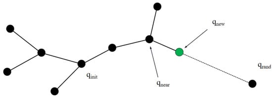 The extensively growing random tree (RRT) algorithm was introduced by LaValle []. By utilizing an incremental forward sampling approach, he constructed a search tree and subsequently explored this tree structure to derive a path. Subsequently, as the number of sampled points increases, the algorithm persists at refining the path until reaching the target point or reaching the maximum allowable iterations []. The RRT* algorithm demonstrates progressive refinement, with the path becoming increasingly optimized as the iteration count rises. Although the RRT algorithm is a relatively efficient method that is capable of addressing route planning challenges involving non-holonomic constraints and offers substantial benefits for various aspects, it does not provide assurance of yielding a suitably optimized, feasible path. As a result, numerous enhancements to the RRT algorithm have focused on addressing the issue of path optimization, with the RRT* algorithm being one such endeavor. In [], the authors introduced an innovative technique named PI-DP-RRT, which merges pre-existing automatic identification system (AIS) data and the Douglas–Peucker (DP) compression method for ship trajectory planning. In [], the presented approach introduces a path planning strategy that incorporates the impact of environmental disruptions using a Virtual Potential Field RRT* technique. Initially, the virtual potential field RRT* technique was developed to chart the desired path, building upon the foundation of the RRT* algorithm. Subsequently, an anti-environmental disturbance technique was introduced that employs a deep recurrent neural network PI controller. This controller facilitates the unmanned surface vehicle (USV) in mitigating environmental disturbances and preserving its trajectory alignment with the intended path. In another article [], to address the problem of conventional route planning methods having path search rules disconnected from the practical maneuvering capabilities of unmanned surface vehicles (USVs), a novel route planning approach called ‘state prediction rapidly exploring random tree (spRRT)’ is introduced. In the context of USV route planning, RRT algorithms face challenges in handling dynamic environments, high computational costs, sensitivity to parameter tuning, and limited adaptability to uncertainty. These limitations can hinder real-time decision making and optimal path generation. Consequently, further research is needed to enhance the efficiency, robustness, and adaptability of RRT-based methods for effective USV navigation. Figure 4 shows the working mechanism of the RRT algorithm.