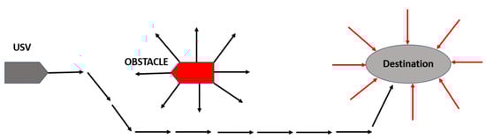 The APF method is advantageous because it is easy to implement and does not demand substantial computational power. This allows for real-time control of USVs and the ability to prevent collisions. However, the occurrence of local minima is a notable drawback []. Because the resulting force pressing on the USV is balanced in some circumstances, such as when it runs into a U-shaped obstruction, the algorithm may cause the USV to proceed in an endless loop instead of to its intended location. Additionally, because of the fluctuating impacts of opposing barrier gravitational fields, traveling between barriers that are closely spaced may be impossible or result in oscillation []. To address the issue of encountering local minima, additional methods are integrated with artificial potential fields (APFs), such as in []. In a study based on simulation [], in order to achieve trajectory planning in real time for automated docking, a novel method known as the ‘extended dynamic window approach’ is presented. This approach utilizes potential fields and incorporates a nonuniform Theta* algorithm to explore global paths while considering potential obstacle risks, thereby avoiding the possibility of being trapped in a local minimum. Figure 5 shows the working mechanism of the APF algorithm.