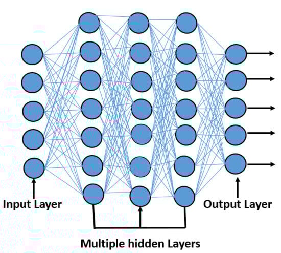 In 1944, McCulloch Pitts proposed the neural network algorithm []. It has evolved into what is now referred to as an artificial neural network (ANN). Additionally, this methodology is applied to enable navigation within unfamiliar surroundings []. An artificial machine learning technique known as a neural network (NN) is derived from a mathematical simulation of information handling as seen in the human brain. A neural network and its variations, like the artificial neural network (ANN), provide robust solutions for navigating unknown environments and ensuring safety, especially with methods such as the NN based on COLREGS and risk assessment. Algorithms like convolutional neural networks (CNNs) and residual convolutional neural networks (R-CNNs) improve real-time path planning and quality, even in dynamic settings. However, challenges include computational complexity, particularly with large-scale graphs or maritime USVs. Bio-inspired neural network (BINN) algorithms may struggle with producing smooth paths for USVs due to large turning angles. Despite limitations, adaptations like the full-coverage neural network (CCNN) streamline computation, enhance coverage efficiency, and achieve globally optimal paths while avoiding dynamic obstacles in USV path planning. Three tiers make up its basic structure: the input layer, intermediate hidden levels, and the output layer []. Each layer has neurons that are connected to every other neuron that can be found in its underlying layer, and their inputs are processed by using the connecting weights. The information coming from the input layer’s neurons are then multiplied by weights before being sent as the input to the layers that are hidden, whereby each neuron is then given a bias value. The primary limitation of this algorithm is that it demands an extended training period to attain desirable outcomes []. In reference [], to fulfill the demands of the coverage route planning task for USVs, a coverage route planning technique is presented. This method relies on an enhanced neural network inspired by biological processes. In addition to this, the approach incorporates the model of a template technique and a jump point exploration algorithm. These additions address the limitations of the initial algorithm, which struggles to fully encompass and navigate around obstacles when in close proximity to them. In another article [], for the inaugural instance, a neural network algorithm called the ‘complete coverage neural network (CCNN)’ is introduced for route planning in USVs. This CCNN algorithm streamlines neural activity calculations, leading to a noteworthy reduction in computation time. Reference [] explores the issue of tracking control for USVs when faced by uncertainties from both internal and external sources, alongside potential injection and deception attacks. A fresh approach to adaptive neural network tracking control is put forth. To solve control design difficulties, the methodology adopted incorporates the use of a backstepping design framework. In study [], in order to mitigate the effects of time-fluctuating gain resulting from potential intrusion and subterfuge attacks, indirect adaptive neural approaches and single-parameter learning methods are used. Reference [] introduced a specialized control scheme, known as ‘robust adaptive neural network control’, designed for achieving dynamic positioning in marine vessels. The objective is to ensure a predefined level of performance in the presence of model uncertainties, external disturbances, and input saturation. Figure 6 shows the architecture of a neural network algorithm.