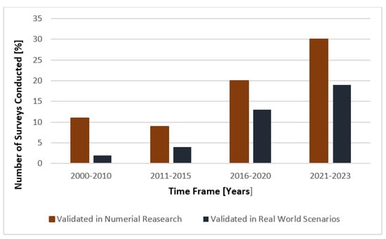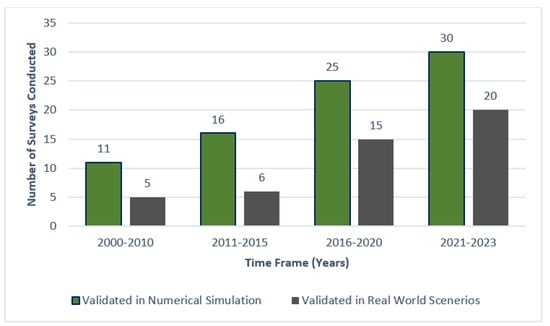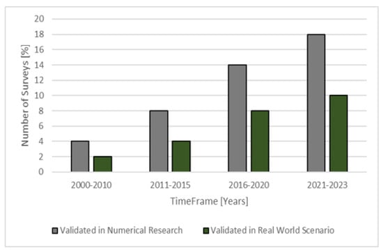 After a thorough review on the existing literature within the realm of route planning and obstacle avoidance for USVs, a comprehensive categorization of these studies was conducted based on both their chronological order and the methodologies employed to assess the efficacy of the proposed algorithms. They are divided into four intervals: up to 2010, 2011–2015, 2016–2020, and from 2021 onward. The research was segmented into two distinct categories outlined as follows: the first classification comprises algorithms verified through numerical research, and the second classification incorporates algorithms applied in practical scenarios, which features USV control methodologies that have been introduced and assessed for their efficacy within authentic environments involving dynamic and static obstacles.