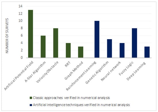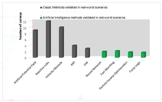 Covering approximately 70 percent of the Earth’s surface, the ocean is a vast domain studied by oceanographers—a multidisciplinary scientific branch that explores the geological, biological, chemical, and physical aspects of this dynamic environment []. USVs are extensively utilized for search, patrol, resource exploration, and various other tasks due to their compact size and affordable price [,]. Over the past few years, there has been a notable rise in the deployment of USVs and ground and air vehicles across diverse environments. These vehicles are predominantly autonomous, operating with varying degrees of self-governance. While discussions about autonomous vehicles usually focus on air or ground platforms, USVs are equally significant, albeit less prevalent and commercially adopted. As artificial intelligence technology continues to advance, the maritime transportation sector is striving to enhance safety, efficiency, and profitability. The most recent yearly assessment of marine accidents and incident reports has revealed that navigational accidents, including collisions, contacts, and groundings/stranding, account for 44 percent of all reported incidents []. The evolution of the shipping industry has always focused on improving navigation safety and enhancing transportation advantages. Enhancing the safety of vessel navigation has been a significant focus in the realm of marine transportation engineering and is a driving force behind the demand for USVs and their technological requirements. Each year, human mistakes or negligence, like inadequate lookout by the officer on watch (OOW), contribute to numerous marine accidents. The implementation of automated navigation effectively takes over the role of human pilots in managing vessel maneuvers and cargo transport, significantly reducing the likelihood of accidents caused by human error. Currently, autonomous technology is predominantly employed in USVs and submersible robots; however, fully autonomous navigation for cargo ships is not yet achievable. Collision avoidance navigation systems utilize various technologies and are subject to advanced research efforts. USVs must possess the capability to navigate independently and evade collisions with other ships or obstacles. In addition, they should exhibit behavior and functionality reminiscent of manually operated vessels. Hence, it is imperative that USVs are equipped with intelligent techniques for collision avoidance and route planning that ensure their secure operation in dynamic and intricate waterways []. The exploration of navigation systems for USVs began in the early 2000s []. Table 1 indicates the list of surveys conducted for USV route planning and avoidance of collisions.