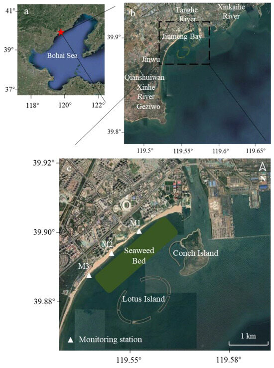 Jinmeng Bay, surrounded by multiple artificial structures, is an anthropogenically influenced bay in the Bohai Sea, China (Figure 1). Lotus Island, submerged breakwaters, and Conch Island have been successively built since 2011. The currents in the nearshore waters were obviously weakened by the artificial structures (~0.3 m/s), with an average water exchange period of 22 days. Jinmeng Bay is mainly dominated by a regular diurnal tide while the tidal currents are regular semi-diurnal type. The bay is relatively shallow (water depth < 13 m) and the turbidity in the southeast of Lotus Island is about 13.5 NTU. The sea surface temperature remained suitable (12–26 °C) from April to September for the green tides, which is a principal factor influencing species succession in Jinmeng Bay. The dominant species are Ulva pertusa, Bryopsis plumosa, and Ulva prolifera, in turn, during the process of blooms. Enormous macroalgae accumulated in the nearshore waters of Jinmeng Bay, and some macroalgae migrated southwestward along the coastline and affected other bathing beaches, including Jinwu, Qianshuiwan, and Geziwo.
