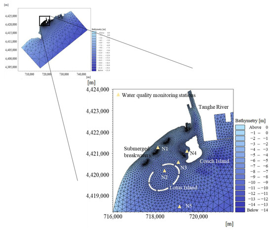 To resolve the artificial islands in the study area, an unstructured mesh (triangular grid) was used to represent the complex geometry of Jinmeng Bay (Figure 2). A total of 5969 nodes and 10,986 elements were applied in the region, and the mesh size decreased from 4 km in the open sea to 8 m nearshore. Considering the effectiveness and accuracy during the calculation, a hydrodynamic model was established on the triple-nested grids as described in our previous study [37].