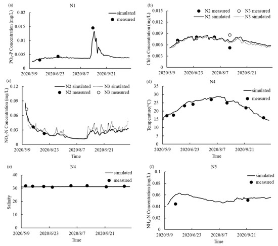 Measured and simulated (a) PO4-P concentration, (b) Chl-a concentration, (c) NO3-N concentration, (d) temperature (e) salinity, and (f) NH4-N concentration in Jinmeng Bay.