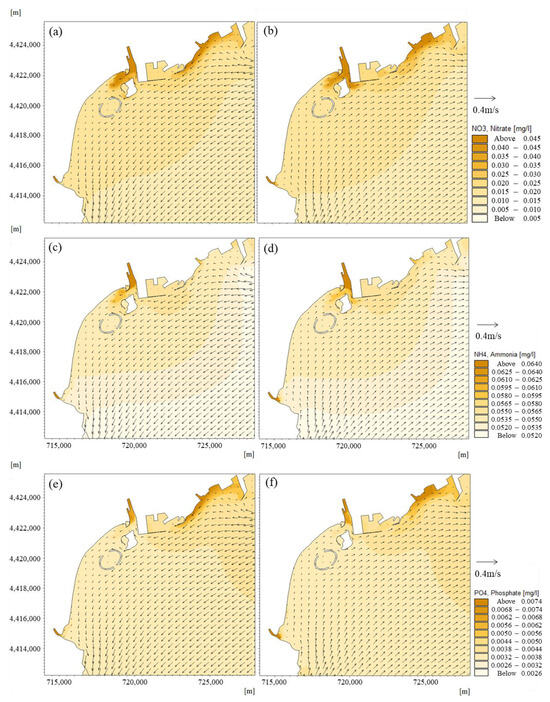 Modeled currents and distributions of NO3-N (a,b), NH4-N (c,d), and PO4-P (e,f) at peak flood (a,c,e) and peak ebb (b,d,f).