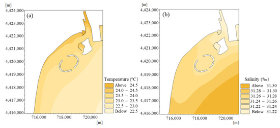 Simulated spatial distribution of (a) temperature and (b) salinity in June 2020.