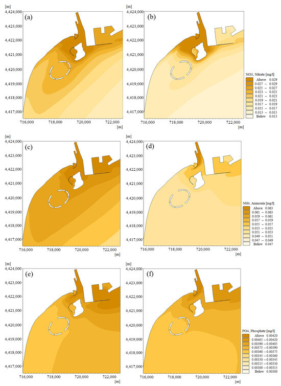 Modeled monthly averaged NO3-N (a,b), NH4-N (c,d), and PO4-P (e,f) concentrations in June (a,c,e) and July (b,d,f) 2020 in Jinmeng Bay.