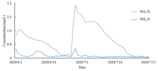 Variations in NO3-N and NH4-N concentrations in the Tanghe River in June and July 2020.
