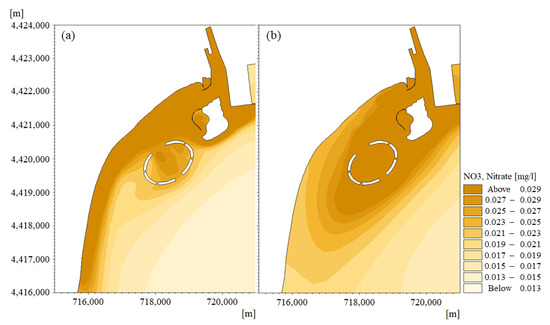 Modeled NO3-N concentrations on (a) 10 September and (b) 30 October 2020, in Jinmeng Bay.