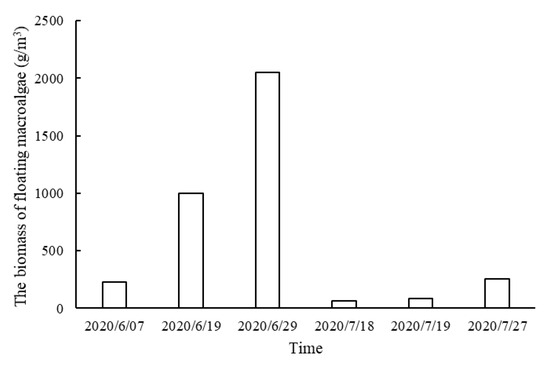 Biomass of green-tide algae in Jinmeng Bay in June and July 2020.