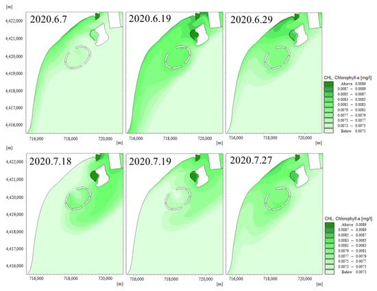 Nutrients are essential for the growth and propagation of green algae [41,42,43,44]. Using a horizontal trawling sampling method modified from Wang et al. [45], field observations of floating macroalgae were conducted at the following three locations (Figure 1): M1 (39.901 N, 119.552 E), M2 (39.895 N, 119.543 E), and M3 (39.890 N, 119.536 E). In June, the average biomass of green-tide algae in the water of Jinmeng Bay was the highest, at 799.3 g/m3, while in July it was only 151.5 g/m3 [5], indicating that the biomass of floating macroalgae in Jinmeng Bay decreased significantly in July 2020 (Figure 9). Considering that Chl-a is a commonly used indicator for algal biomass [8], the spatiotemporal distribution of simulated Chl-a concentrations is shown in Figure 10 for the date of the field survey (Figure 9). The area where the simulated Chl-a concentration changes is the same as where the green-tide algae is distributed. The concentrations of Chl-a increase from early June to mid-June and then reach their maximum on June 29. However, Chl-a concentrations decrease sharply on July 18, especially in the coastal areas of Jinmeng Bay, and remain at a lower level until the end of July. On July 27, the Chl-a concentrations recover slightly in the inshore waters. In general, the overall model’s results match not only the field observations with reference to the spatial distribution trends, but also those related to green tide dynamics changes in Jinmeng Bay. Field surveys can only present the biomass at the measurement point (limited by the number of sampling stations and sampling time), whereas numerical simulations can clearly show the spatio-temporal changes in Chl-a. For instance, the biomass of floating macroalgae on July 18 and July 19 is only 67.5 g/m3 and 83.8 g/m3, respectively, and the simulated Chl-a concentration also keeps decreasing from 0.0083 mg/L to 0.0070 mg/L in coastal shallow waters.