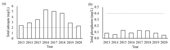 Annual variations in (a) total nitrogen and (b) total phosphorus concentrations from 2013 to 2020 in the Tanghe River. The black dashed line represents Class V of the Chinese Surface Water Quality Standard.