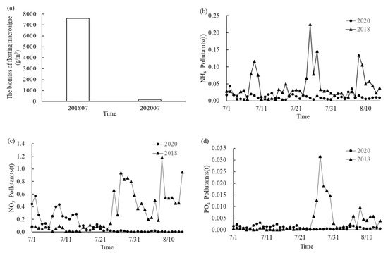 Comparison of (a) the biomass of floating macroalgae, (b) NH4-N flux, (c) NO3-N flux, and (d) PO4-P flux in July 2018 and 2020.