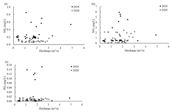 Variations in (a) NH4-N concentration and river discharge, (b) NO3-N concentration and river discharge, and (c) PO4-P concentration and river discharge in July 2018 and 2020.