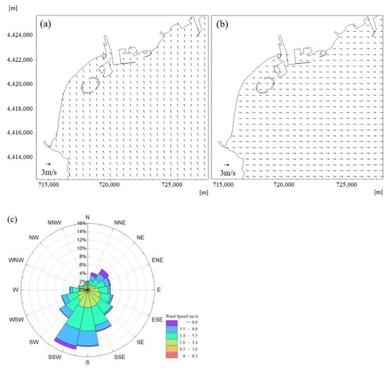 Besides eutrophication, wind is another important contributing factor for the distribution and variability of Chl-a [42,51,52,53]. Figure 14a,b compares the monthly average wind field in July 2018 and 2020. In July 2018, the wind in Jinmeng Bay blew from the southeast, while in 2020, the wind kept blowing from the west, and there was little change in wind speed between the two years (with an average wind speed of 2.0 m/s and 2.3 m/s in July 2018 and 2020, respectively). As shown in Figure 14c, the prevailing wind directions are from WSW to ESE, which accounted for 66% of the data during 2018–2022. Hence, we use southeasterly, southerly, and southwesterly wind as the representative wind in the following analysis to investigate the effect of wind direction on Chl-a variability in Jinmeng Bay. The simulation was carried out with a constant wind speed of 5.5 m/s since about 57% wind speeds are between 3.4 and 5.5 m/s and 5.5 and 8 m/s (Figure 14c). The field observations in 2020 were adapted to the river input. The model’s results revealed that Chl-a displayed significant spatial variation under different wind directions (Figure 15). When southeasterly winds prevail, there are higher Chl-a concentrations in Jinmeng Bay (Figure 15c). In contrast, southwesterly winds are more likely to suppress the supply of nutrition from the Tanghe River to the coastal areas, thereby reducing Chl-a concentrations in Jinmeng Bay (Figure 15a). Under southerly winds, Chl-a levels are in between the above two scenarios (Figure 15b). The average concentrations of Chl-a in the seaweed beds under southwesterly, southerly, and southeasterly wind are 0.0050 mg/L, 0.0053 mg/L and 0.0076 mg/L, respectively.