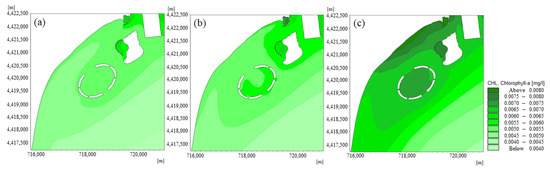 Spatial distribution of simulated Chl-a concentrations under (a) southwesterly, (b) southerly, and (c) southeasterly wind.