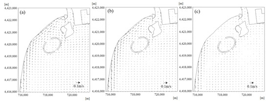 Modeled wind-induced residual current field in Jinmeng Bay under (a) southwesterly, (b) southerly, and (c) southeasterly wind.