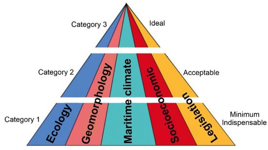 To identify the most relevant variables for coastal vulnerability studies, the variables of the studies in Table 2 were categorized following Silva et al. [14]. In total, six information groups are suggested: ecology, geomorphology, geology, marine climate, socioeconomic, and legislation, organized in three relevance categories: 1—minimum indispensable, 2—acceptable, and 3—ideal. These categories allow us to go from the general to the detailed, by increasing the number of variables when calculating vulnerability: