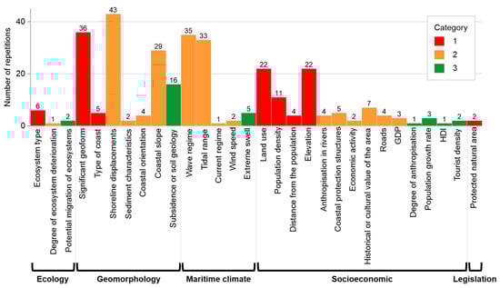 It can be seen in Figure 3 that there are no variables in Category 1 for Maritime climate. In this case, the “Main coastal modeler” variable could be added as a basic (Category 1) characteristic if quantitative maritime climate variables of Category 2 are not available, since modeling agents determine the sedimentary budgets at the local level, as well as determine sediment transport distributions and maintain a correlation with the morphology of the coast [116]. Also, in the literature and in practice, coastal protection and management measures are developed according to the main hydrodynamic forcing. For example, the design of structures for coasts is governed by waves and tides, the construction of infrastructure at a certain distance of the coast is governed by the tide, etc.