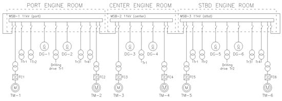 The drillship mentioned in this research is a Samsung 12000 design capable of operating in water depths up to 12,000 ft. Its diesel–electric system is powered by six high-voltage diesel generators that are installed onboard. The power system is configured in three separate engine rooms (PS, CENT and STB), so that two diesel generators with all auxiliary systems are in each of these engine rooms (Figure 2). This structure of the power supply system provides high system redundancy and protection against potential threats to operations, equipment, and personnel.