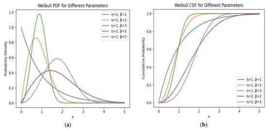Weibull functions for different values of ratio and shape parameters: (a) Weibull PDF function; (b) Weibull CDF function.