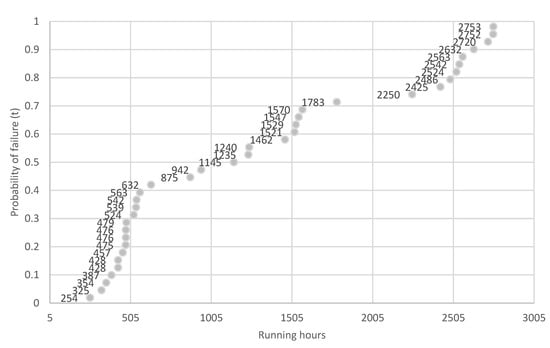 The ratio parameter η of the Weibull distribution represents the characteristic maintenance period. According to the analysis, the characteristic service life of the fuel injector is 1308 working hours. According to the manufacturer’s specifications [] (remove all valves, check nozzle elements, and replace if necessary), it is scheduled every 3000 operating hours. Accordingly, the maintenance period should be reduced to every 1308 operating hours or alternatively, 1500 operating hours to better group the maintenance tasks.