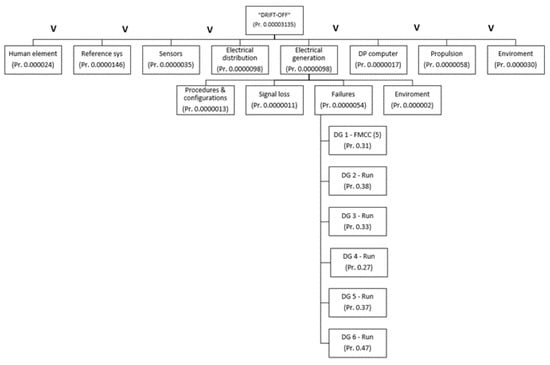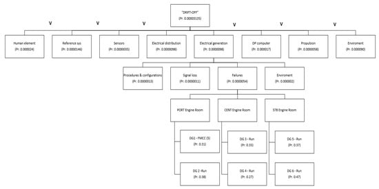 The definition of the consequences of a vessel failure caused by engine operation can be very unclear due to possible interactions and other factors such as weather conditions. However, we assume here that a failure of three engines during closed-bus operation, i.e., a failure of two engines in the same engine room during open-bus operation, creates the conditions for the drift-off of the ship. Following the research of Varela et al. [], probability values for the underlying causes of drift-off were calculated and based on these calculations, diagrams of failure trees for engine operation in closed and open circuits were created (Figure 7 and Figure 8).