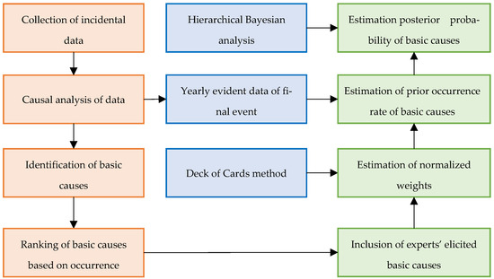First, raw data are collected from offshore databases and published statistical investigation reports on allisions. The analysis of data can reveal significant insights about the circumstances of allision. In particular, from the analysis of data, the immediate causes (causal factors) and their basic causes are identified. Based on the number of occurrences of each basic cause, they can be ranked from least to most observed. From understanding the causation of an accident, more basic causes are identified by experts’ elicitation. For this purpose, a well-known decision-making tool called the Deck of Cards method (DCM) [55,56] is used to assign normalized weights to these basic causes. A novel scheme is proposed to transform accident occurrence into the occurrence rates of basic causes by applying the relative importance of each basic cause deduced from the Deck of Cards method. From the collected data, the annual frequency of accidental events (allision) is gathered, and when multiplied by the weights, the occurrence rate of each basic cause for each year is deduced. The probability of basic causes can be estimated as the posterior distribution mean of the annual occurrence rates using hierarchical Bayesian analysis. This scheme and the methods involved are detailed in the following subsections.