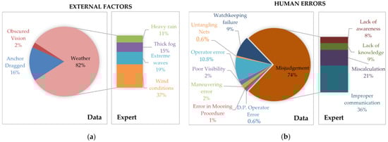 Figure 4 presents the basic causes of external factors (a) and human errors (b), with each figure split into two frames that are distributed based on observed data (Data) and expert elicitation (Expert). As seen in Figure 4a, external factors are in the majority of events caused by adverse weather conditions (82%), followed by anchor dragging (16%) and obscured vision (2%). It is deemed important to break down further possible weather elements that are important for allision scenarios. As discussed above, secondary databases are consulted, which identify that heavy rain, thick fog, extreme waves and wind conditions are the main weather conditions causing allision. The quantitative details are derived from expert elicitation, as discussed and implemented in the next section.