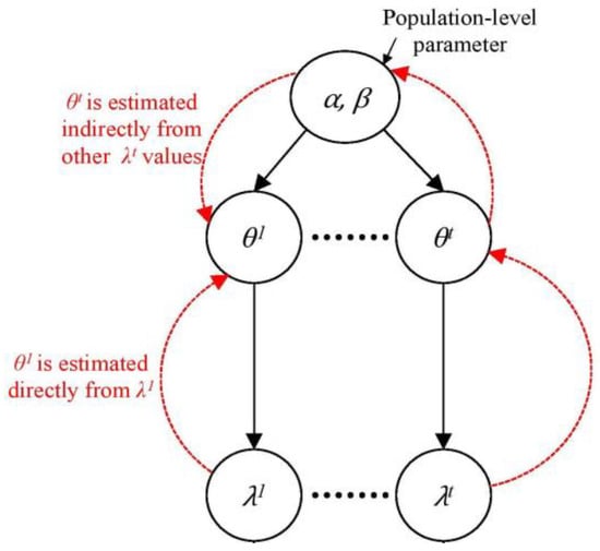 As shown in Figure 5, the hierarchical Bayesian model uses groups of exchangeable information to deduce θt, which is similar but does not need to be identical. In the present study, θt represents the occurrence probability of a basic cause for the year “t”. These θts are exchangeable and are assumed to be a sample from a common population distribution; therefore, they are assigned common prior α and β, known as the population level parameter. This approach anticipates that the samples in datasets often form clusters or groups within which some properties are shared. Thus, through the structure (as illustrated by the dashed lines in Figure 5), information is borrowed from one group to another while estimating a group-specific parameter. A vital feature of this approach is that the observed data within a group can be used to estimate the population distribution (α and β) of θts even though the values of θts are not themselves observed. Further details regarding the applications of HBA can be derived from references [63,64,65]. The HBA generates the most suitable values for the parameters of interest (e.g., θt) involving minimum uncertainty [63,66,67,68].
