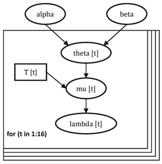 The annual data about the contributing occurrence rates () of basic causes (h = 1 to 42) can be grouped into t = 1 to 16 (for the years 2000 to 2015) data groups corresponding to each year. Figure 5 shows an HB modelling scheme used in the present context. It should be noted that the HBA is conducted for each basic cause “h” (=1 to 42) independently, and therefore, the subscript “h” is deliberately omitted from the following discussion.