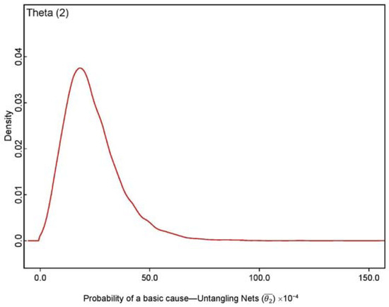 Noting that prior distributions are assigned for α and β, the model samples from their joint posterior distribution. This is because the base node “lambda [t]” and diffused parameters’ nodes “alpha” and “beta” are in a convergent direction (see Figure 6). Therefore, when data are detected via initialization of the node “lambda [t]”, the nodes “alpha” and “beta” become conditionally dependent on their joint posterior distribution. Subsequently to the above realizations, the posterior distribution of “theta” can be deduced as ~ gamma (α, β), which is the mean of all the posteriors of θts. The present methodology assumes that this posterior distribution can be used as the probabilities of basic causes. Figure 7 illustrates the posterior distribution inferred as the probability density function of basic causes—Untangling nets (i.e., h = 2). The complete results are presented in the last column of Appendix A.