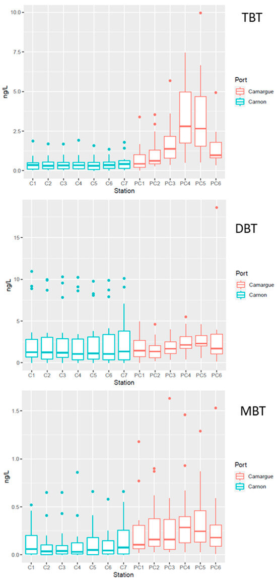 - Alzieu, C.; Michel, P.; Tolosa, I.; Bacci, E.; Mee, L.D.; Readman, J.W. Organotin Compounds in the Mediterranean: A Continuing Cause for Concern. Mar. Environ. Res. 1991, 32, 261–270. [Google Scholar] [CrossRef]