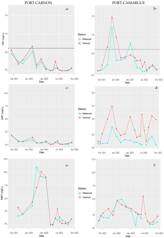 - Briant, N.; Bancon-Montigny, C.; Freydier, R.; Delpoux, S.; Elbaz-Poulichet, F. Behaviour of Butyltin Compounds in the Sediment Pore Waters of a Contaminated Marina (Port Camargue, South of France). Chemosphere 2016, 150, 123–129. [Google Scholar] [CrossRef] [PubMed]