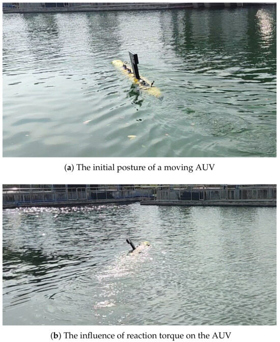 Unfortunately, to simplify the controller design, most researchers choose to simplify the dynamics model. Incomplete degrees of freedom in just modeling the abstract path tracking algorithm is certainly not a problem, but the actual situation path tracking will allow the AUV to perform various types of underwater tasks such as spot blasting, sonar probing, etc. Although a six degree-of-freedom-based controller is particularly important, few of them consider the effect of reaction moments. Most researchers consider the complexity of the ocean environment and introduce constant or time-varying external disturbances into the system. However, the fact is that the AUV’s own thrusters also affect its attitude control. Nearly all AUV’s thrusters use propellers, and forward thrusters are typically single propellers. In addition to forward thrust, propellers generate reverse torque as they rotate [24]. The presence of the reverse moment affects the roll angle of the AUV itself, causing the body of the AUV to roll. Figure 1a is the initial attitude of the AUV when it is in motion, and Figure 1b is the attitude of the AUV when it is moving along a straight line. It can be clearly seen that the AUV has a rolling motion in addition to moving along a straight line. After multiple experimental observations, we find that the rolling motion of the AUV also changes under different thrusts, and the larger the thrust is, the more obvious the rolling motion is. In order to improve the attitude stability of AUV path-tracking control, this paper proposes a new controller named DLISMC and compares it with PID and DLPID control methods. Simulation experiments consider the reaction torque generated by the AUV itself in addition to the common marine environment disturbance, and introduce the reaction torque model generated by the propeller rotation into the dynamic model to optimize the controller with static compensation.