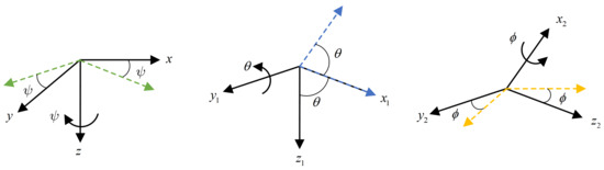 The relationship between the inertial frame and body-fixed frame has been described in [31]. Hence, we introduce the relationship between the AUV’s lineal acceleration and the inertial frame AUV’s position. As shown in Figure 3, there are three basic rotation modes between the body-fixed frame and the inertial frame. Under the premise of the lineal acceleration vector of the AUV relative to the earth represented in the body-fixed coordinate system, we can compute the lineal acceleration vector in the earth-fixed coordinate system by , , and . In the simulation section, we use the rotation transformation matrix to get the error value between the expected speed and actual speed. The rotation transformation matrix can be expressed as: