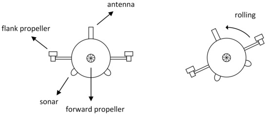 As we know, when the propulsion propeller of AUV rotates to generate thrust, it will also generate obvious reaction torque. Figure 4 shows the effect of reaction torque during AUV motion from a rear-view perspective. The AUV has a total of seven thrusters, where four thrusters on the flanks and two thrusters on the sides are symmetrically distributed. It is assumed that the reaction torque generated by these six thrusters can cancel each other when the AUV is moving, so only the reaction torque generated by the main thruster will affect the attitude of 6-DOF AUV and cause the AUV to roll sideways.