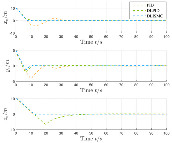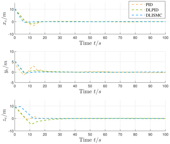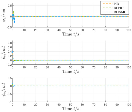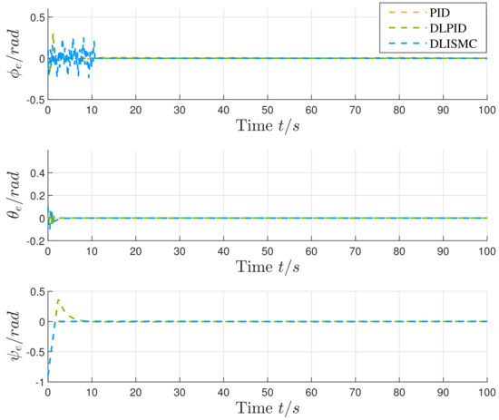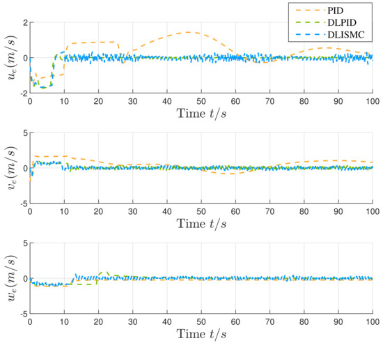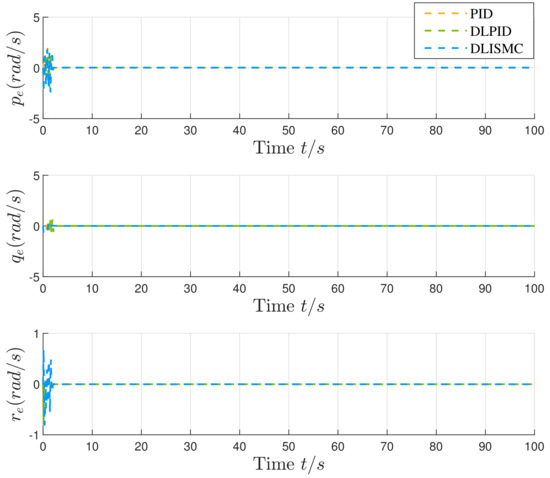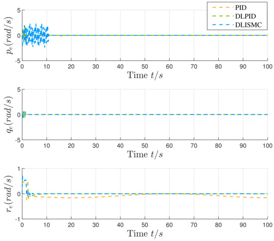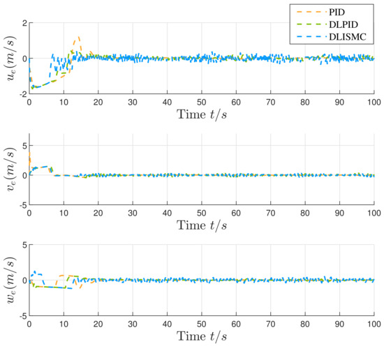 Figure 7 demonstrates the 3D plots of the AUV tracking the cosine curve under different control methods. From these results, it can be seen that the DLISMC algorithm tracks the desired trajectory earlier than the PID or DLPID. Figure 8 and Figure 9 show the positional and angular errors of the AUV during tracking. In terms of position error, there is not much difference between the two methods in x and y directions from these results. In terms of the convergence time in the x and y directions, the proposed DLISMC is 16% and 23% faster than the DLPID algorithm, and 70% and 72% faster than the PID algorithm, but all of them eventually ensure that the errors are within a certain range. In terms of convergence time in the z direction, the DLISMC is 0.1% faster than the PID and it is clear that the DLISMC is 74% faster than the DLPID, and that the error saturation of the DLISMC is smaller than that of the DLPID algorithm. This is due to the integral term of the PID controller. Figure 10 and Figure 11 show the linear velocity error and angular velocity error of the AUV during tracking, respectively. In terms of angular velocity error, both control methods start with a significant buffer, which is related to the initial position of the AUV, indicating that the AUV is adjusting the attitude of the angle-tracking profile. Figure 12 shows the control input for AUV and Figure 13 gives the curve of reaction torque.