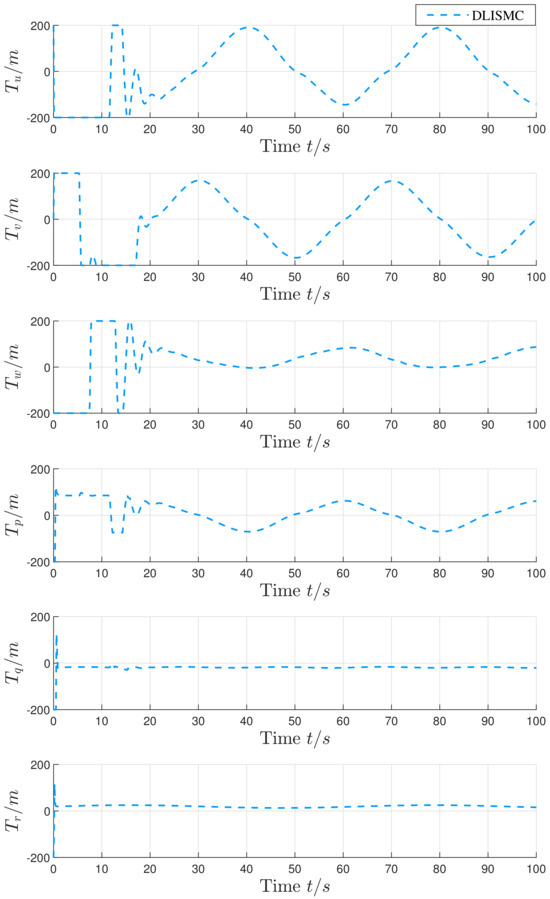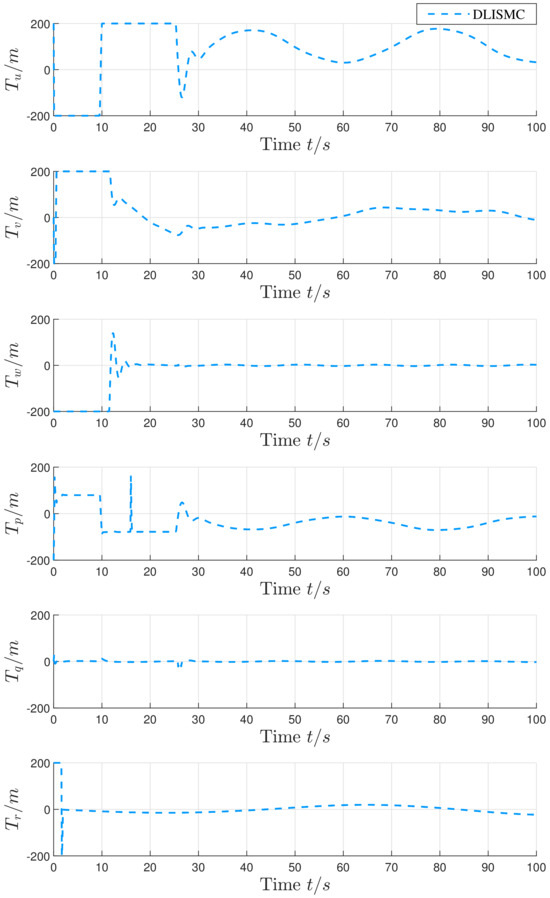 Figure 14 represents a three-dimensional view of the AUV-tracking spiral curve under different control methods. It is obvious from these results that, after a period of time, the controllers designed by the two methods can track the desired trajectory well. Figure 15 and Figure 16 represent the position error and angle error of the AUV during path tracking. It can be seen that the curves of the DLISMC and DLPID are stable and the error is within a certain range, which means that the whole position loop is convergent and stable. Moreover, the curve of the DLISMC fluctuates less than that of DLPID. In addition, the DLISMC converges 35%, 68%, and 62% faster than the DLPID and 50%, 60%, and 27% in the x, y, and z directions, respectively. The large amplitude of the DLPID in these results is caused by the integral term of the original PID method. Figure 17 and Figure 18 display the linear velocity error and angular velocity error of the AUV during trajectory tracking. It is obvious that results of the DLPID curve and DLISMC curve are stable at zero, which means that the entire speed loop is stable. Figure 19 and Figure 20 give the control input of AUV’s thrust and reaction torque moments, respectively. From these results, it can be seen that the thrusts during tracking are all within the +/−200 N limit, and the curve of the thrusts changes smoothly. The variation of reaction torque is also consistent with the above model, and the DLISMC controller can stably control the AUV for tracking even with reaction torque disturbances. In the presence of interference, the performance of the DLPID is significantly lower than that of the DLISMC, which has stronger anti-interference stability. Under the influence of reaction torque, the DLPID algorithm is unstable in the roll angle and roll speed, and cannot stabilize the attitude of the AUV. These results verify that the proposed DLISMC algorithm can overcome these problems perfectly.