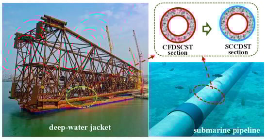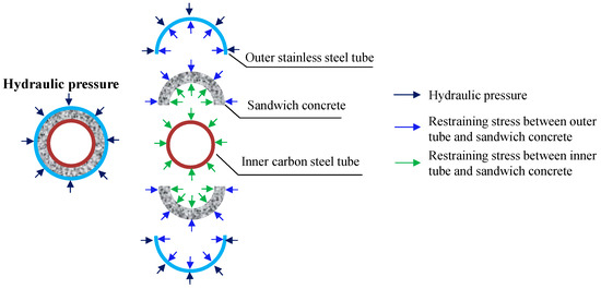 Corrosion damage in ocean environments has received significant attention for steel or steel–concrete structures, such as pile foundations and jacket platforms [1,2]. As a typical high-performance structure, concrete-filled double-skin steel tubular (CFDST) structures increasingly demonstrate a promising application in ocean engineering for bearing complex loads [3,4,5,6]. Nevertheless, the traditional CFDST structure typically comprises double-skin carbon steel tubes and sandwich concrete, referred to as the concrete-filled double-skin carbon steel tubular (CFDSCST) section, which is prone to corrosion [5,6,7]. Consequently, a new type of double-skin composite member, i.e., stainless steel–concrete–carbon steel double-skin tubular (SCCDST) members, has been proposed to enhance the corrosion resistance of CFDSCST members (Figure 1) [8,9]. The utilization of SCCDST members is expected to expand significantly in coastal and deep-sea engineering projects. Design methods suitable for land engineering are ever-improving for double-skin composite members with CFDSCST or SCCDST sections [6,7,8,9,10,11,12,13]. In contrast to land sites, the deep-water environment subjects SCCDST members to external hydraulic pressure, where the composite performance is influenced by the combination of passive and active confinement actions (Figure 2) [13]. The passive confinement action refers to the interactive behavior between the double-skin stainless or steel tubes and sandwich concrete, and the active action is derived from the external hydraulic pressure. The design method mentioned earlier, based on passive confinement action, is no longer applicable to deep-sea engineering [14,15]. Therefore, it is vital and necessary to conduct research on the mechanical performance and calculation theory of SCCDST members under hydraulic pressure in order to provide guidance for deep-water projects.