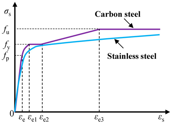 As for the stainless steel in Figure 3, it usually has a strong nonlinear stress–strain relationship; therefore, the method proposed by Rasmussen was herein adopted to simulate the outer austenitic stainless steel tube [41]: