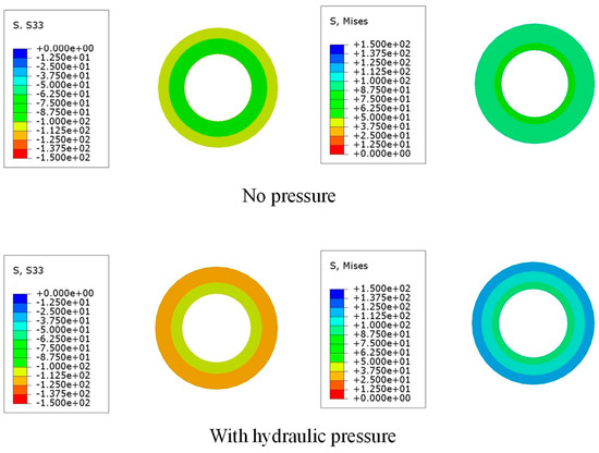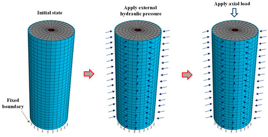 The sandwich concrete and double-skin tubes (stainless steel and carbon steel) were simulated using the C3D8R solid element and S4R shell element, respectively, where the mesh sizes in the circumferential direction and longitudinal direction were equally divided into thirty-two elements and thirty elements after the sensitivity analysis of mesh size, respectively. Moreover, the mesh size through the thickness direction of sandwich concrete was set as six layers. The normal and tangential interactions of the stainless steel–concrete–carbon steel interfaces were computed using the hard contact method and Coulomb friction method. The friction coefficient was set to 0.6 [38]. No experimental investigations have been conducted on the concentric compressive behavior of SCCDST members subjected to external hydraulic pressure. Therefore, the analytical finite element (FE) model was initially validated by performing tests without hydraulic pressure (0 MPa). Subsequently, the validated FE model was further enhanced to analyze the axial compressive behavior of SCCDST members under different external hydraulic pressures. In these aforementioned FE models, the axial load was applied using a displacement-controlled mode, where the FE models with hydraulic pressures were initially subjected to the target pressures before the application of axial load (Figure 4). Validation details and further analytical behavior are displayed in subsequent sections.