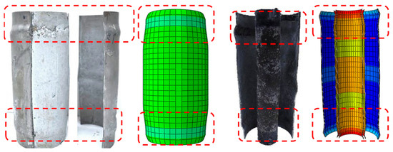 In order to validate the established FE model, the collected test results from a previous study [26] were compared against the failure mode, axial bearing capacity, and curve of load versus axial strain. The FE model implemented in Figure 5 demonstrates good agreement with the occurrence of local buckling in the double-skin tubes, as well as the crushing of concrete. The comparison between the anticipated axial compressive strengths (NFE) and the corresponding test strengths (NT) of SCCDST members in Table 1 demonstrates the accurate predictive capabilities of the FE model, with a mean value NFE/NT of 0.9985. In Figure 6, the typical full-range axial load versus strain curves of the tested SCCDST members are compared, considering the limitation of page space. It can be observed that the load–displacement curves of the FE models exhibit favorable agreement with the pre-peak stiffness, ultimate load-carrying capacity, and nonlinear behavior during the post-peak stage of the tested SCCDST members. Given the validation of the three aspects mentioned above, the established FE model can effectively simulate the compressive behavior of SCCDST specimens and can provide basic guidance for the analysis of axial compression performance under deep-water pressure.