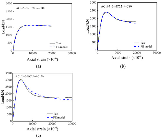 Verification of load–displacement curves. (a) AC165×3-HC22×4-C40; (b) AC165×3-HC22×4-C80; (c) AC165×3-HC22×4-C120.