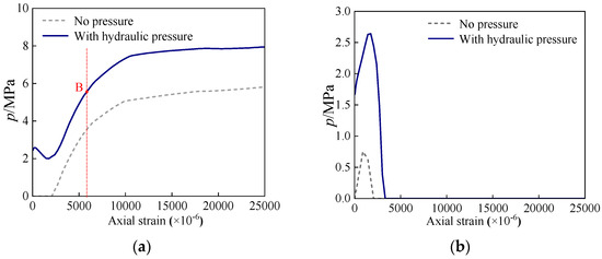Analysis on the full-range behavior of an SCCDST member with deep-water hydraulic pressure is offered in Figure 7 and Figure 8, in which its performance response is compared to its counterpart without hydraulic pressure. Generally, the variation trend of SCCDST members with hydraulic pressure behaves analogously to that of the SCCDST member without hydraulic pressure, but the member exposed to deep-water hydraulic pressure displays a higher bearing capacity to resist axial load with an increased percentage of 10.04%, where the contributions of inner carbon steel tubes are nearly the same for both. In the condition of hydraulic pressure, the contribution of the outer stainless steel tube is slightly higher than that of the member without hydraulic pressure. The primary disparity that leads to the augmentation of load-bearing capacity can be attributed to the enhanced contribution of sandwich concrete when subjected to an elevated level of tri-axial compression in hydraulic pressure, therefore resulting in the higher axial strength or von Mises stress in Figure 9. Moreover, through the curve of axial load versus strain in Figure 7, three typical stages can be divided by four feature points for the SCCDST member with hydraulic pressure. During the stage OA, the SCCDST member is in an elastic working state. Subsequently, the outer stainless steel tube, sandwich concrete, and inner carbon steel tube gradually show elastic–plastic performance, in which the material strengths of cross-sectional materials are fully utilized. At point B, the sandwich concrete, inner tube, and outer tube contribute 57.08%, 28.45%, and 14.47% of the total axial bearing capacity of the SCCDST member, respectively. During the stage O-A-B, the confining stress between the outer stainless steel tube and sandwich concrete is increased quickly (Figure 8a), but the confining stress of the inner carbon steel tube and concrete gradually degrades to zero, as displayed in Figure 8b. Thereafter, the SCCDST member progresses to the failure phase accompanied by capacity degradation, while the concrete undergoes severe crushing and the outer or inner tubes reach a highly plastic state, resulting in the rapid increase in confining stress of the outer tube to concrete (Figure 8a). As illustrated in Figure 8, the existing hydraulic pressure promotes the composite performance between double-skin tubes and concrete infill, leading to an initial active confining stress and a heightened state of the full-range process, from which the confining stress between the inner tube and sandwich concrete is comparatively lower than that between the outer tube and concrete, and it rapidly decreases before reaching the maximum load point B.