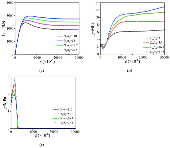 Influence of Do/to at the water depth of 300 m. (a) Load–displacement curves; (b) Confining stress between outer stainless steel tube and sandwich concrete; (c) Confining stress between inner carbon steel tube and sandwich concrete.