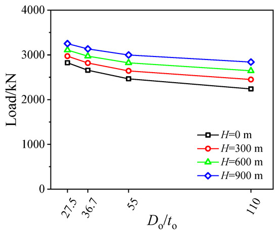 Influences of the Do/to ratio on full-range responses are shown in Figure 10. Due to similar patterns, the analysis results at a depth of 300 m are used as an example for explanation. Altering values of Do/to ratios was achieved by keeping diameter Do consistent but changing values of thickness to. The axial bearing capacity is enhanced with a decrease in the Do/to ratios, while the post-peak behavior, such as ductility, is also improved (Figure 10a). When it comes to the impact on the contact pressure between double-skin tubes and sandwich concrete, reducing the Do/to ratios, i.e., increasing the area of the stainless steel tube, gradually enhances the confining stress of the outer stainless steel tube on the sandwich concrete due to the improvement in the confinement coefficient, but it has an opposite impact on the confining stress of the inner tube to sand concrete because of the amplified nonuniform confinement effect. Generally, amplifying the Do/to ratios causes a gradual decrease in axial bearing capacity at the same water depth (Figure 11), e.g., at the water depth H = 300 m, improving the Do/to ratio from 27.5 to 36.7, 55, and 110, respectively, reduces the axial compressive strength by 5.16%, 11.08%, and 17.57%. And at the same value of Do/to ratio, a greater water depth, namely due to higher hydraulic pressure, can enhance the axial bearing capacity for SCCDST members, e.g., for a member with Do/to = 55, its axial compression strength is gradually increased by 7.18%, 14.51%, and 21.62% with increasing water depth from 0 m to 300 m, 600 m, and 900 m, respectively.