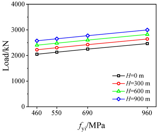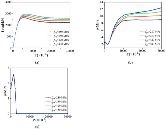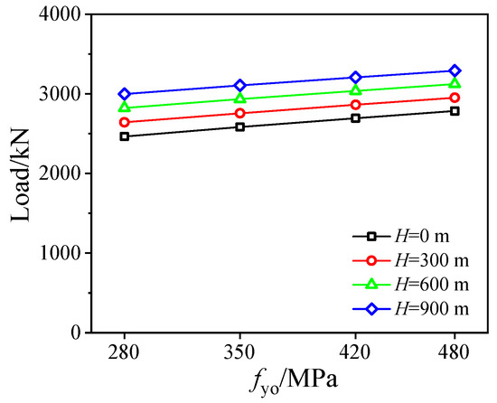 Influences of fyo are displayed in Figure 14 and Figure 15. Improving the yield strength of the outer stainless steel tube can directly increase the axial bearing capacity in a linear way, as shown in Figure 14a and Figure 15, where the capacity is respectively increased by 4.61%, 8.35%, and 11.71% by enhancing yield strength fyo from 280 MPa to 350 Mpa, 420 Mpa, and 480 Mpa at the water depth of 300 m. Moreover, increasing water depth also improves the axial compression strength of SCCDST members at a certain strength of fyo, e.g., at fyo = 350 Mpa, changing water depth from 0 m to 300 m, 600 m, and 900 m, respectively, enhances the bearing capacity by 6.64%, 13.53%, and 20.21%. Increasing yield strength fyo actually increases the confinement coefficient, thereby enhancing the confinement stress between the outer stainless steel tube and sandwich concrete (Figure 14b), but this has a minor impact on that between the inner tube and sandwich concrete (Figure 14c).